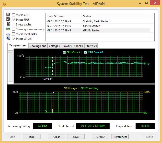 При одновременной загрузке ядер процессора тестом Stress FPU и графического ядра тестом Stress GPU частота процессора скачет от 1,2 до 2,4 ГГц. Соответственно скачет и температура ядер процессора — от 63 до 70 °С.