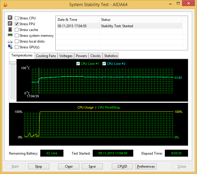 При нагрузке процессора тестом Stress FPU, который использует вычисления c плавающей запятой и в большей степени нагревает процессор, температура ядер процессора первоначально увеличивается до 67 °С, после чего частота процессора снижается с 2,4 ГГц до 2,2 ГГц, а температура ядер снижается до 63 °С.