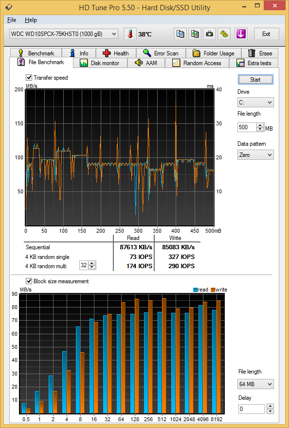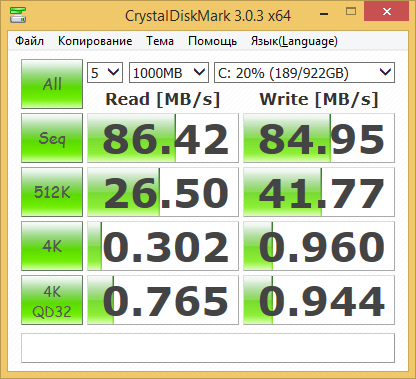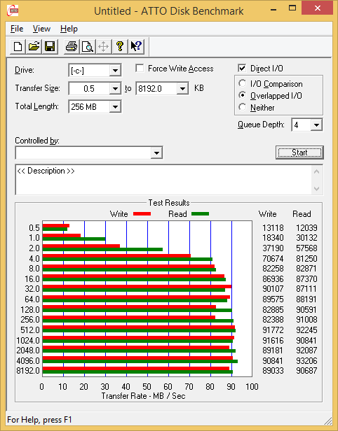 Утилита ATTO Disk Benchmark определяет максимальную скорость последовательного чтения и записи на уровне 90 МБ/c, что вполне типично для HDD и, конечно же, очень мало в сравнении с SSD.