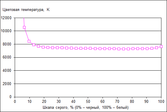 Цветовая температура ЖК-экрана ноутбука Alienware 13 стабильна по всей шкале серого (темную область можно не учитывать) и составляет примерно 7300 K.