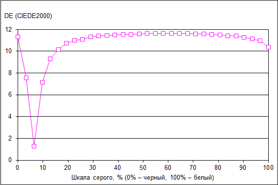 Что касается точности цветопередачи (дельта Е), то ее значение не превосходит 12 по всей шкале серого. Не очень хороший результат, и с «попаданием в цвет» у этого экрана есть небольшие проблемы. Впрочем, для игрового применения этот недостаток, конечно же, несущественен.