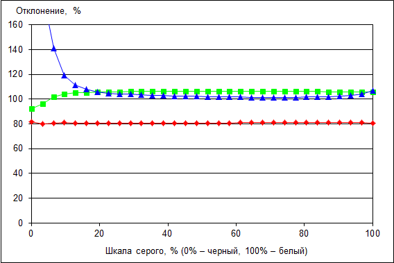 Основные цвета (красный, зеленый, синий) также стабильны по всей шкале серого, но доля красного цвета немного занижена.