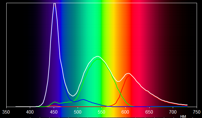 Светофильтры ЖК-матрицы неплохо изолируют основные цвета. Конечно, спектры красного и зеленого цветов немного смешиваются, но это вполне допустимо.