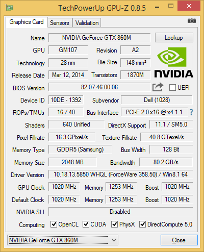 Помимо интегрированного в процессор графического ядра, в ноутбуке Alienware 13 (A13-4316) имеется и дискретная видеокарта Nvidia GeForce GTX 860M c 2 ГБ видеопамяти GDDR5. Собственно, именно наличие этой видеокарты и позволяет рассматривать этот ноутбук в качестве игрового решения.