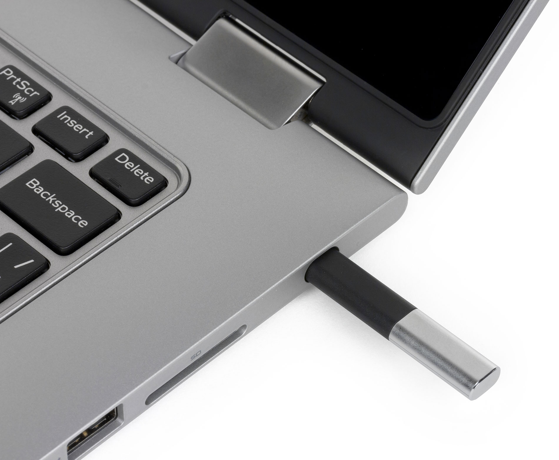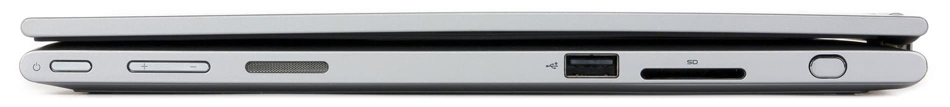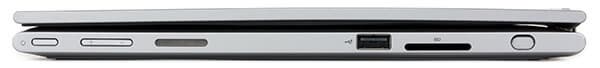 На правом торце корпуса ноутбука расположен разъем порта USB 2.0, слот для карт памяти, кнопка включения питания и кнопка качельного типа для регулировки громкости. Кроме того, здесь же расположена еще одна миниатюрная решетка, закрывающая второй встроенный динамик, а также имеется и ниша, для пассивного стилуса.