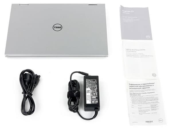 Ноутбук Dell Inspiron 13 7347 (как и все ноутбуки серии Dell) поставляется в простенькой картонной коробке с ручкой. Комплект поставки стандартный для ноутбуков Dell. Кроме самого ноутбука, в комплект входит лишь адаптер питания, гарантийный талон и краткое руководство пользователя.