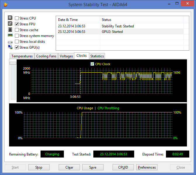 В режиме одновременной загрузки и ядер процессора (Stress FPU), и графического ядра (Stress GPU) температура ядер процессора увеличивается до 65 °С. Частота ядер процессора в данном режиме скачет от 1,1 ГГц до 1,7 ГГц.