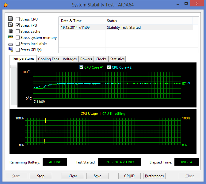 При нагрузке процессора тестом Stress FPU, который использует вычисления c плавающей точкой и в большей степени нагревает процессор, температура ядер процессора увеличивается до 59 °С, а их частота не меняется и составляет 1,7 ГГц.