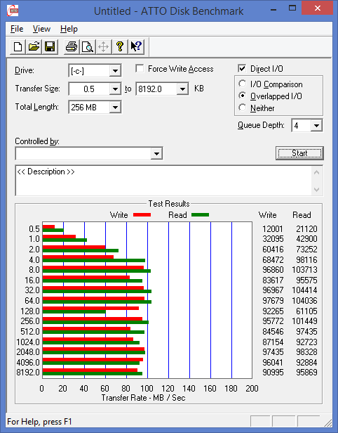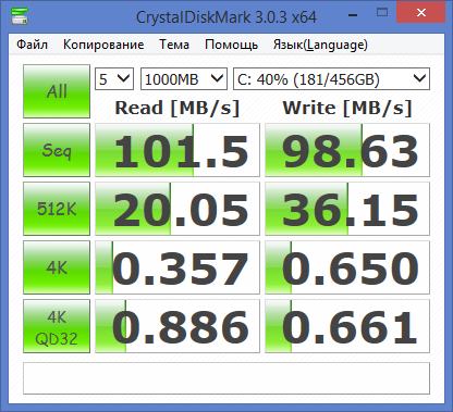 Утилита ATTO Disk Benchmark определяет максимальную скорость последовательной записи и чтения на уровне примерно 100 МБ/с, что вполне типично для ноутбучных 2,5-дюймовых HDD.