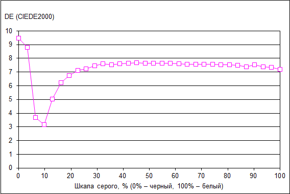 Что касается точности цветопередачи (дельта Е), то ее значение не превосходит 8, что является допустимым результатом для данного класса экранов.