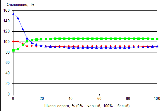 Стабильность цветовой температуры объясняется тем, что основные цвета хорошо сбалансированы по всей шкале серого.