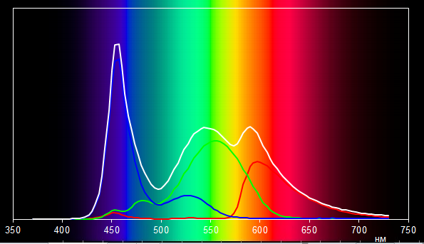 Столь узкий цветовой охват объясняется в том числе и не очень качественными светофильтрами. Во-первых, светофильтры сильно подмешивают компоненты друг к другу. Так, в спектр красного цвета сильно подмешивается зеленый цвет, а в спектр зеленого — синий. Во-вторых, фильтр красного света выделяет максимум в спектре, который относится уже к оранжевому цвету (длина волны 590 нм, а не 620 нм, как обычно), что негативно отражается на цветовом охвате экрана.