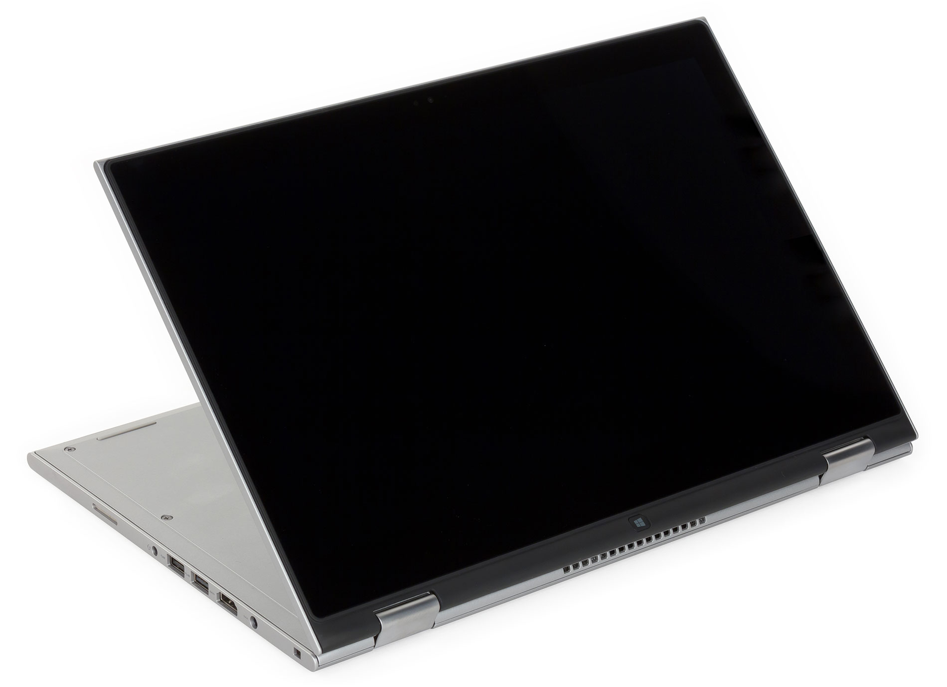 Шарнирная петля имеет достаточно тугой ход, что позволяет зафиксировать экран в любом положении, однако имеется и весьма приличный люфт экрана. Причем наличие такого люфта сильно затрудняет сенсорный ввод в режимах «ноутбук» и «консоль». В режиме «презентация», когда экран опирается одной гранью на стол, а шарнирные петли расположены сверху, никакого люфта, естественно, нет.