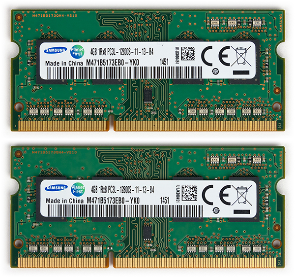 Для установки модулей памяти DDRL-1600 в ноутбуке предназначено два слота, а максимальный поддерживаемый объем памяти составляет 16 ГБ. В нашем случае в ноутбуке было установлено два модуля Samsung M471B5173EB0-YK0 емкостью по 4 ГБ каждый. Естественно, память работала в двухканальном режиме.