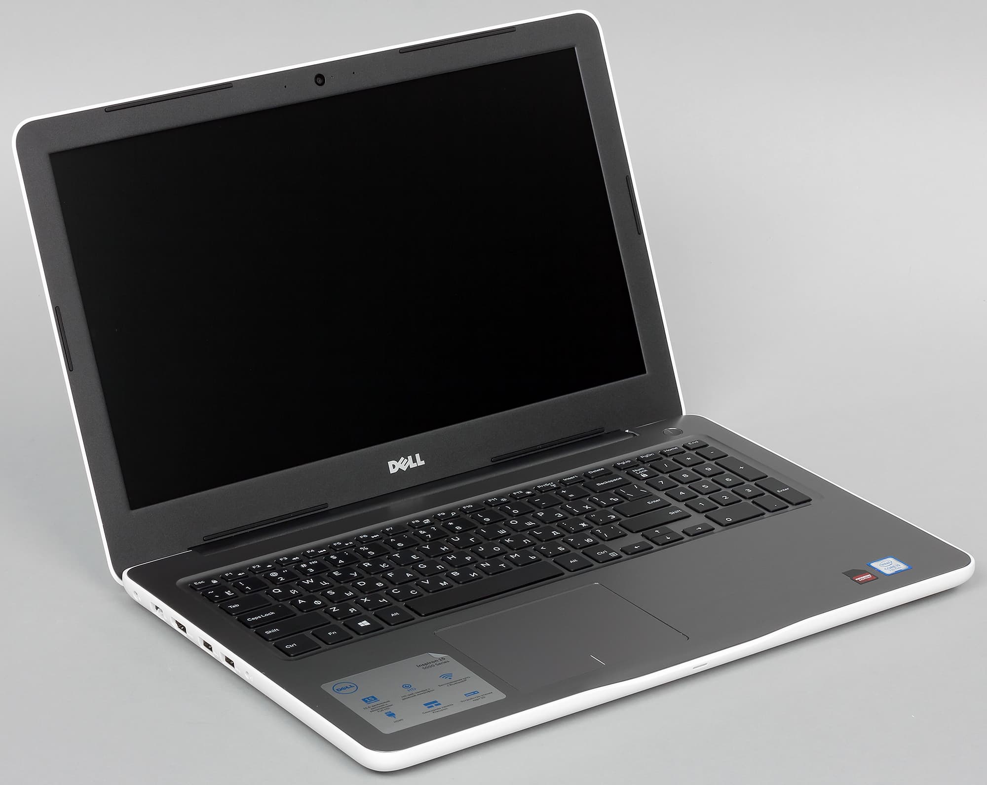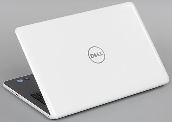 Корпус Dell Inspiron 15 5567 выполнен из пластика, окрашенного в белый цвет. Крышка имеет глянцевое покрытие, на котором хорошо заметны отпечатки пальцев. В центре крышки расположен традиционный зеркальный логотип компании Dell.