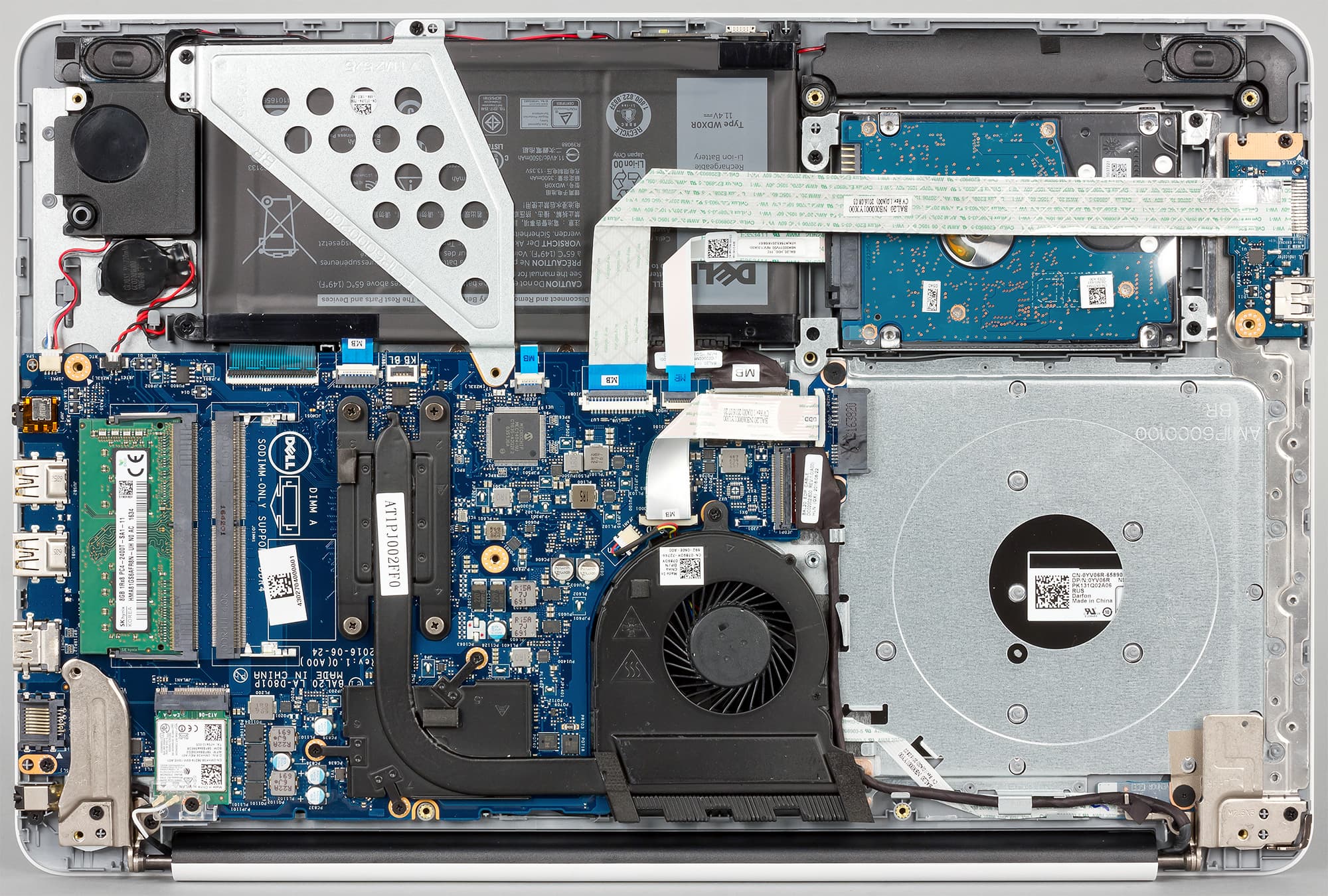 Ноутбук Dell Inspiron 15 5567 довольно просто разобрать. Открутив 15 винтиков, можно снять нижнюю панель корпуса ноутбука. Это позволит получить доступ почти ко всем компонентам ноутбука.