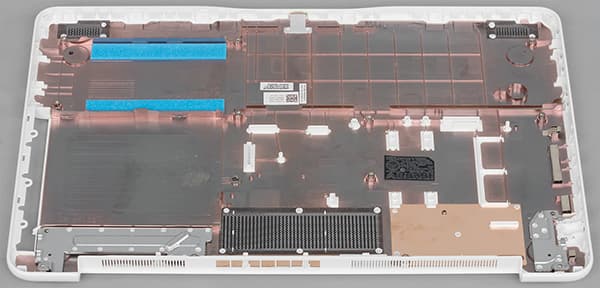 Нижняя панель корпуса сделана из матового белого пластика. На нижней панели расположены вентиляционные решетки и две решетки встроенных динамиков.