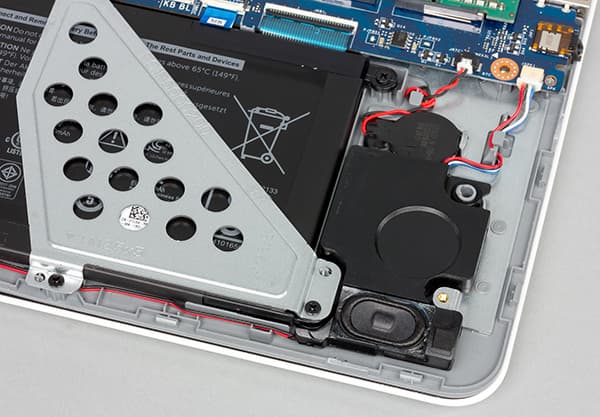 Аудиоподсистема ноутбука включает в себя два динамика, а также комбинированный аудиоразъем типа миниджек (на микрофон и наушники). Аудиотракт основан на кодеке Realtek ALC256.