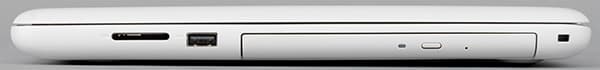На правом торце расположены порт USB 2.0, слот картовода, разъем для замка Noble и лоток оптического привода.