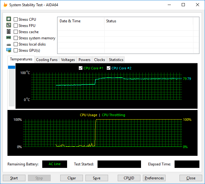 Теперь рассмотрим режим стрессовой загрузки процессора при одновременной загрузке (FurMark) видеокарты. В этом режиме загрузки температура ядер составляет 79-80 °C, а их частота составляет 2,5-2,6 ГГц. Скорость вращения вентилятора увеличивается до 5400 об/мин.