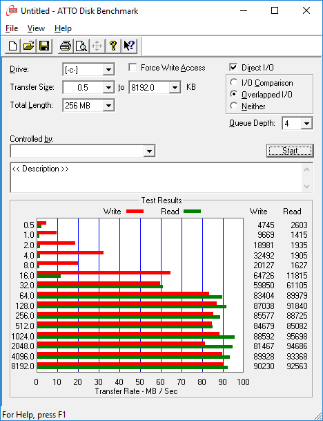 Утилита ATTO Disk Benchmark определяет максимальную скорость последовательного чтения и записи на уровне 90 МБ/с, что по сегодняшним меркам очень мало.