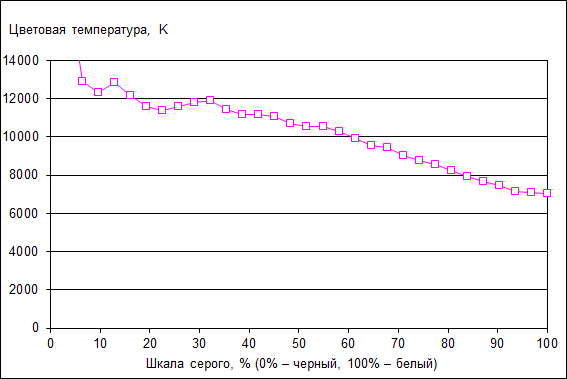 Цветовая температура ЖК-экрана ноутбука Dell Inspiron 15 5567 увеличивается по мере перехода к темным областям. На белом фоне цветовая температура составляет 7000 K, а в темных областях она увеличивается до 12000 К.