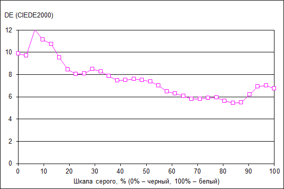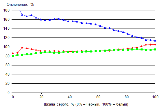 Что касается точности цветопередачи (дельта Е), то ее значение не превосходит 10 (темные области не учитываем), что является вполне допустимым результатом для данного класса экранов.