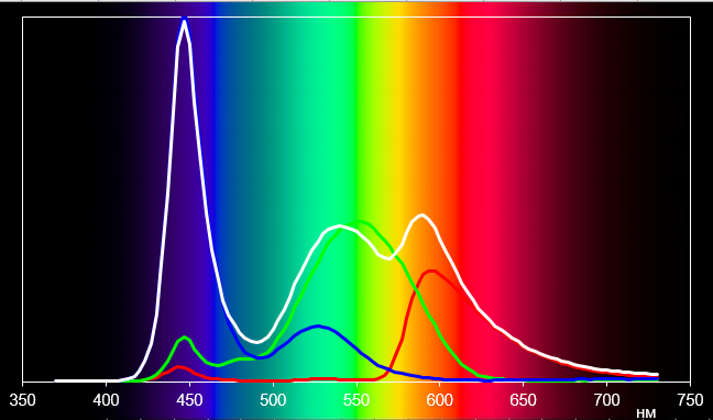 Светофильтры ЖК-матрицы немного подмешивают компоненты друг к другу. Так, спектры красного и зеленого цветов сильно перекрываются. Аналогично, перекрываются спектры синего и зеленого цветов. Нельзя сказать, что такая ситуация типична для ЖК-матриц. Скорее, это признак дешевых TN-матриц с низким качеством.