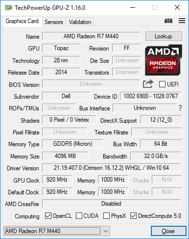 Кроме процессорного графического ядра ноутбук имеет и дискретную видеокарту начального уровня AMD Radeon R7 M440 с 4 ГБ видеопамяти GDDR5 (эта видеокарта распаяна на плате ноутбука). Частота графического процессора составляет 920 МГц, а частота памяти — 1000 МГц.