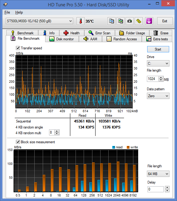 Учитывая разницу в показаниях утилит ATTO Disk Benchmark и CrystalDiskMark, мы дополнительно провели тестирование HDD с использованием утилиты HD Tune Pro v5.50. Результаты тестирования представлены далее.