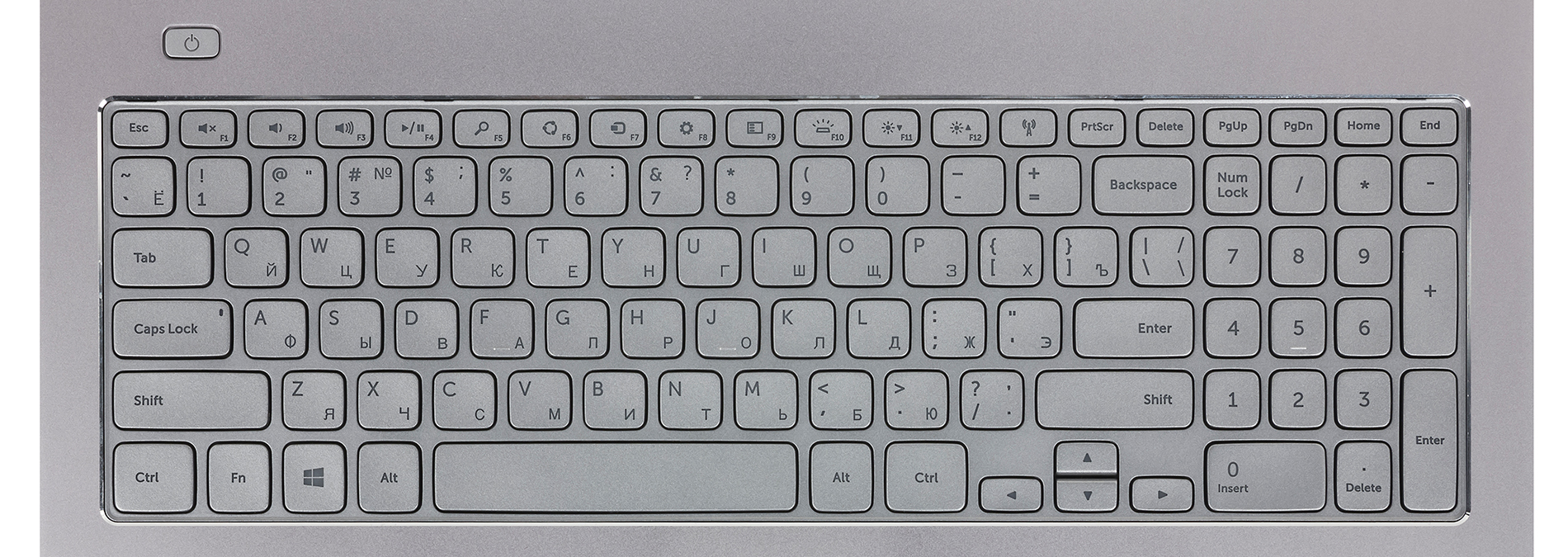 В ноутбуке Dell Inspiron 15 7537 используется клавиатура островного типа с увеличенным расстоянием между клавишами и отдельным цифровым блоком NumPad. Эта клавиатура имеет двухступенчатую подсветку. Клавиши на клавиатуре серебристого цвета (такого же цвета, что и рабочая поверхность), а их размер составляет 15,4×15,4 мм. Основание под клавиатурой немного утоплено относительно рабочей поверхности, а ход клавиши примерно 1 мм.