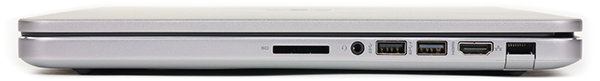 На правом торце корпуса ноутбука расположены еще два разъема USB 3.0, комбинированный аудиоразъема типа миниджек (наушники, микрофон), разъем HDMI, слот для карт памяти и разъем RJ-45. Разъем RJ-45 имеет откидывающуюся крышку, что позволило сделать корпус ноутбука достаточно тонким.