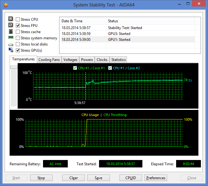 В режиме одновременной загрузки и ядер процессора (Stress FPU), и графического ядра (Stress GPU) частота ядер процессора снижается до 1,5 ГГц, а их температура увеличивается до 75 °С.