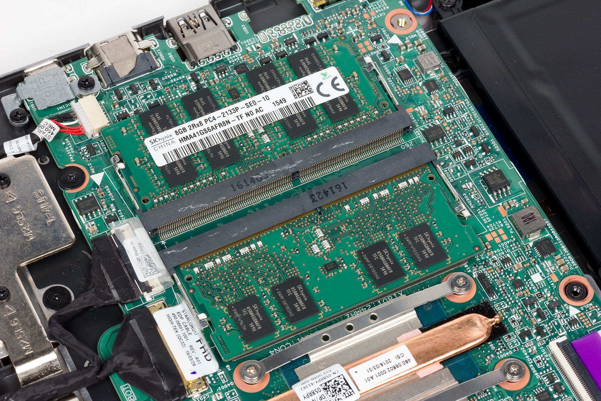Ноутбук Dell Inspiron 17 7778 комплектуется 12 ГБ памяти DDR4-2133. Для установки модулей памяти предусмотрено два слота, и в нашем варианте в ноутбуке было установлено два модуля памяти SK Hynix (4 и 8 ГБ).