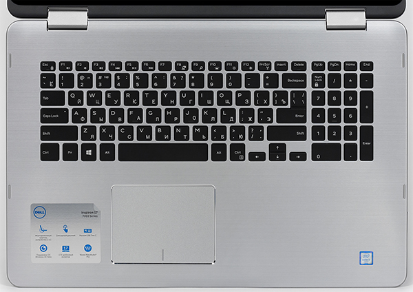 В ноутбуке Dell Inspiron 17 7778 используется тачпад (кликпад) с размерами 105×81 мм. Сенсорная поверхность немного шероховатая на ощупь, ее чувствительность не вызывает нареканий. Тачпад очень удобен в работе, однако отметим, что отдельной функциональной клавиши для отключения тачпада (что актуально при подключении мыши) не предусмотрено.