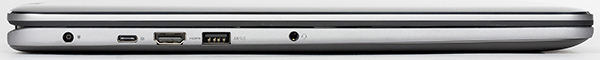 На левом торце корпуса ноутбука расположен один порт USB 3.0 с технологией PowerShare, разъем USB Type-C, видеоразъем HDMI, комбинированный аудиоразъем (миниджек) и разъем питания.
