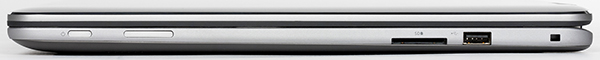 На правом торце, кроме кнопки питания и регулятора громкости, имеется порт USB 2.0, слот для SD-карт памяти и отверстие для редко встречающегося замка Noble.