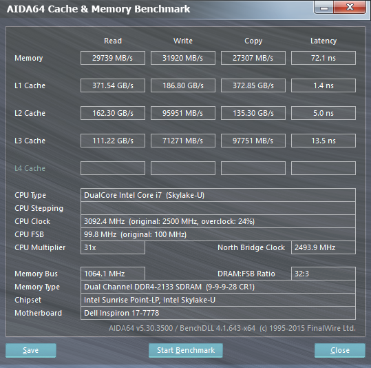 Согласно данным утилиты AIDA64 Cache & Memory Benchmark, скорость записи данных в память составляет 31920 МБ/с, а скорость чтения — 29739 МБ/с. Для памяти DDR4-2133 в двухканальном режиме работы это типичный результат.