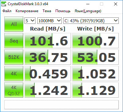 Утилита ATTO Disk Benchmark определяет максимальную скорость последовательного чтения и записи на уровне 100 МБ/c, что вполне типично для HDD и, конечно же, мало в сравнении с SSD.