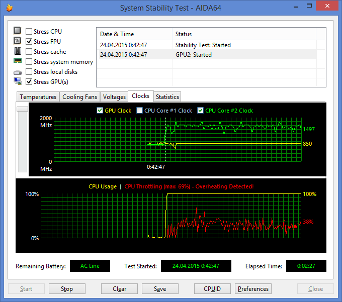 При одновременной загрузке ядер процессора (Stress FPU) и графического ядра (Stress GPU) частота ядер процессора скачет от 900 МГц до 1,6 ГГц. А вот частота графического ядра неизменна и составляет 850 МГц. При этом температура ядер процессора держится на отметке 90 °С, а температура графического ядра составляет 75 °С. Естественно, и в этом режиме загрузки наблюдается троттлинг.