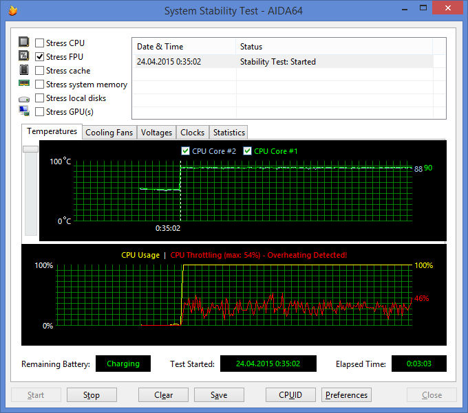 При загрузке процессора тестом Stress CPU (утилита AIDA64 Extreme Edition, тест на стабильность системы), который использует целочисленные вычисления, средняя частота процессора составляет 2,1 ГГц (максимальная частота процессора в режиме Turbo Boost может быть равной 2,9 ГГц). Температура процессора в этом режиме загрузки достигает 90 °С и наблюдается троттлинг.