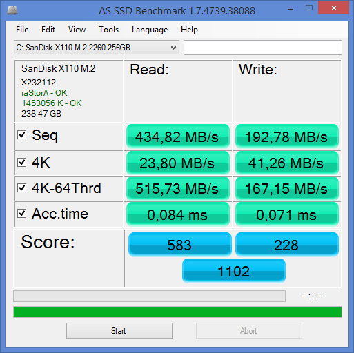 По данным утилиты AS SSD Benchmark 1.7 максимальная скорость последовательной записи составляет 193 МБ/с, а последовательного чтения — 435 МБ/с.