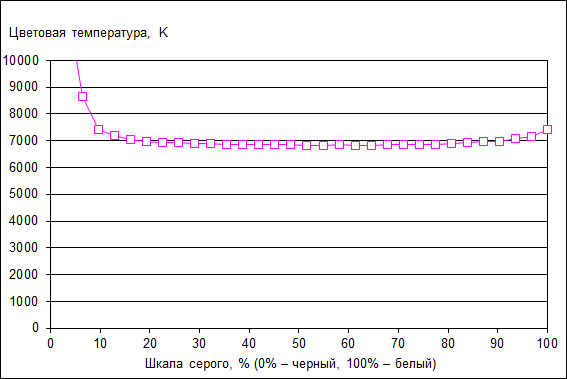 Цветовая температура ЖК-экрана планшета очень стабильна по всей шкале серого и составляет примерно 7000 К (темные области можно не учитывать в силу погрешности измерения).