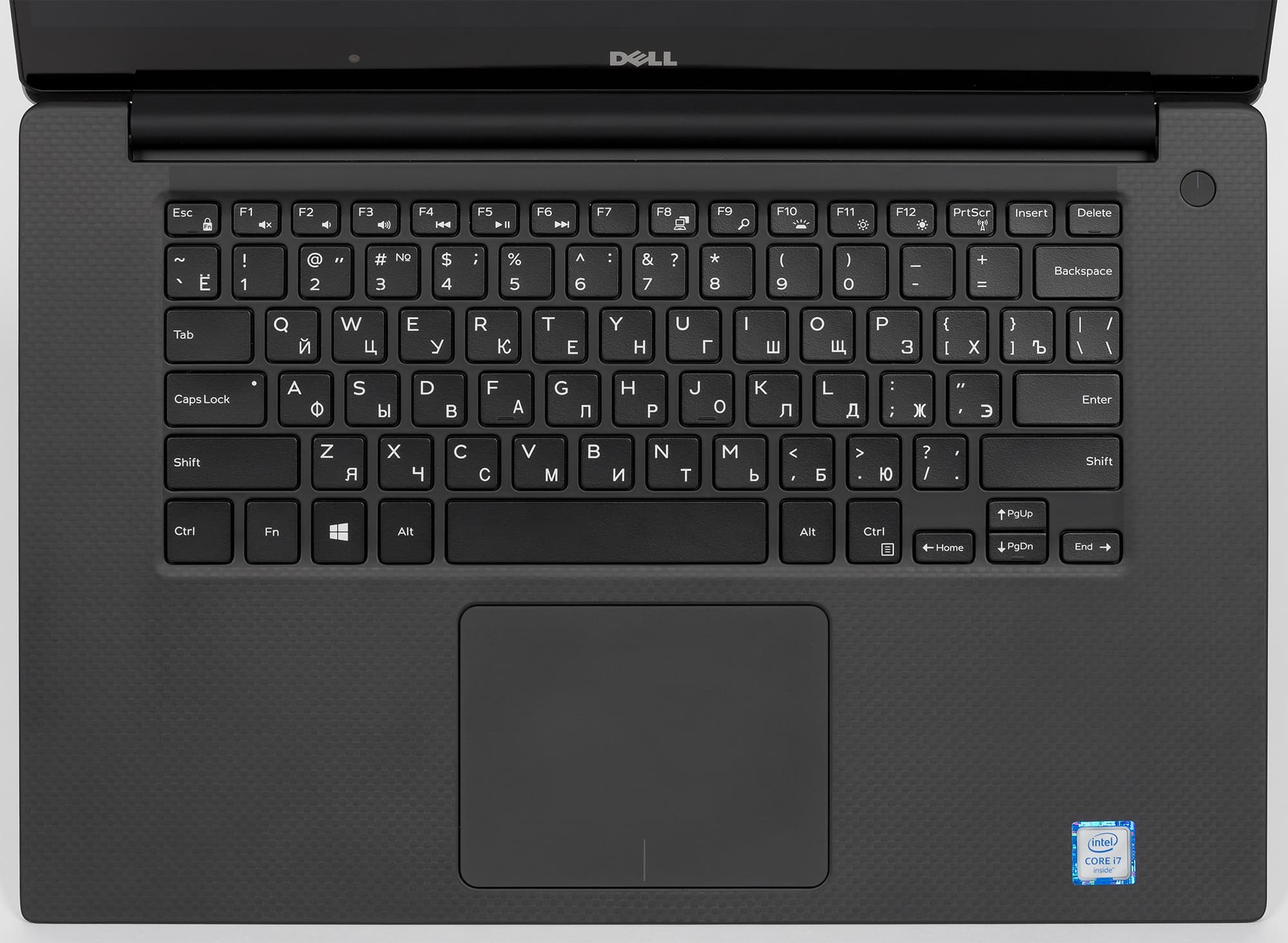 Если открыть ноутбук, то внутри он оформлен в черном цвете. Рабочая поверхность, обрамляющая клавиатуру и тачпад, имеют покрытие типа soft touch и текстурным характерным узором. И нужно сказать, что эта поверхность устойчива к появлению отпечатков от пальцев. Сравнивая Dell XPS 15 9550 с предыдущей моделью Dell XPS 15 9530, отметим, что в Dell XPS 15 9530 рабочая поверхность также имела покрытие типа soft touch, но без текстурного рисунка и она была очень маркая и выглядела всегда заляпанной.