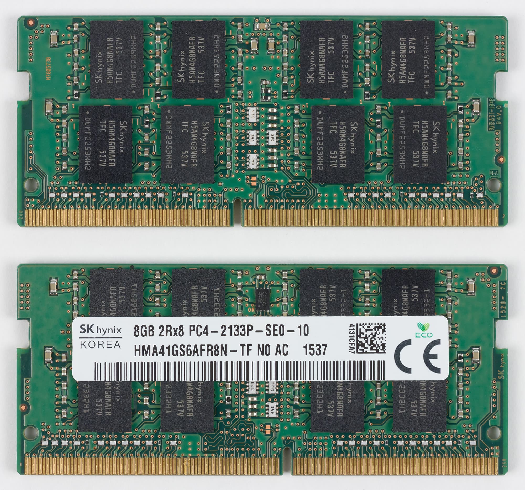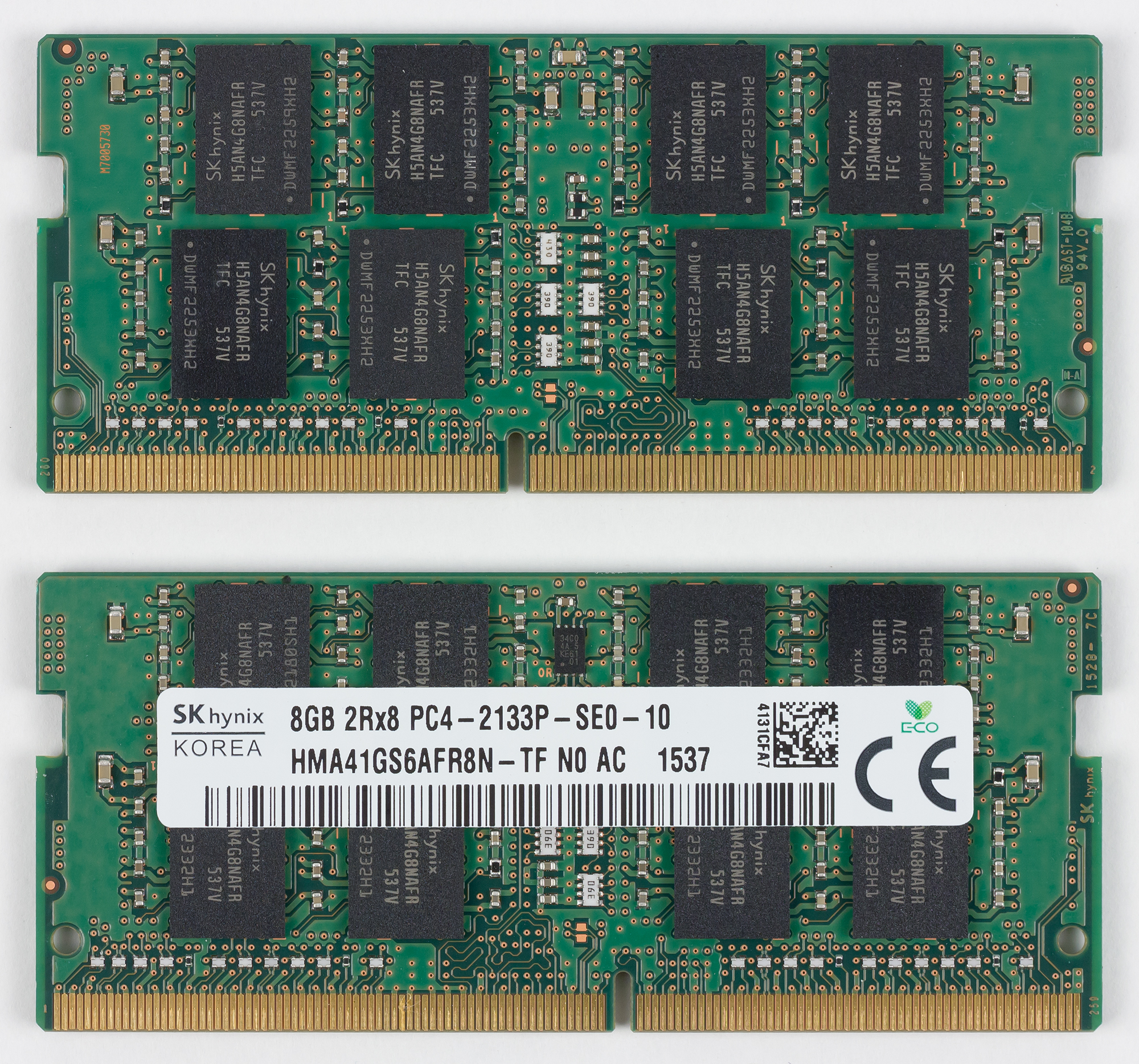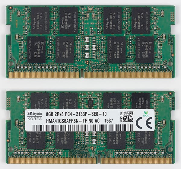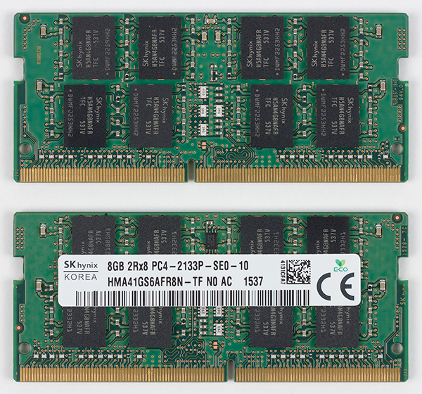 Для установки SO-DIMM модулей памяти в ноутбуке предназначено два слота. В нашем случае в ноутбуке был установлено два модуля памяти DDR4-2133 (SK Hynix HMT41GS6AFR8N-TF) емкостью по 8 ГБ каждый. То есть суммарный объем памяти составлял 16 ГБ, и, естественно, память работала в двухканальном режиме.