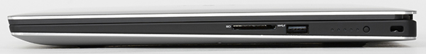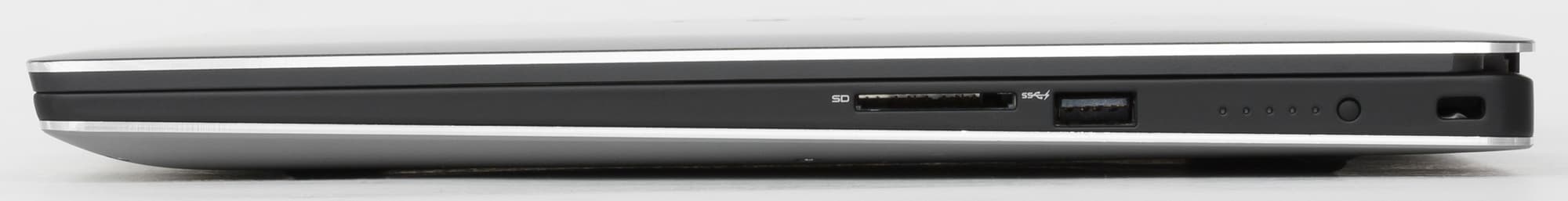 На правом торце имеется еще один порт USB 3.0, слот для SD-карт памяти, отверстие для редко встречающегося замка Noble и кнопка, позволяющая проверить уровень заряда аккумулятора. Эта кнопка дополнена пятью миниатюрными светодиодными индикаторами, и по количеству загорающихся светодиодов можно оценить уровень заряда аккумуляторной батареи.