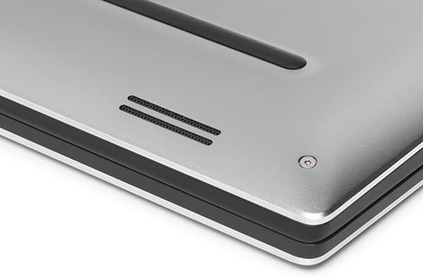 Нижняя панель корпуса ноутбука также сделана из из алюминия серебристого цвета. На нижней панели имеется лишь вентиляционная решетка. Кроме того, на нижней панели корпуса имеются и две широкие прорезиненные ножки, на которых ноутбук устойчиво стоит на любой горизонтальной поверхности.