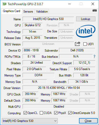 В процессор Intel Core i7-6700HQ интегрировано графическое ядро Intel HD Graphics 530 (Skylake GT2), базовая частота которого составляет 350 МГц, а частота в режиме Turbo Boost — 1,05 ГГц.