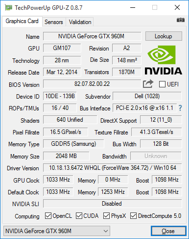 Помимо интегрированного в процессор графического ядра, в ноутбук также комплектуется и графической видеокартой Nvidia GeForce GTX 960M с 2 ГБ видеопамяти GDDR5. Это видеокарта на базе чипа GM107 (архитектура Maxwell 1.0) c 640 ядрами CUDA, 16 ROP-блоками и 40 TMU-блоками.