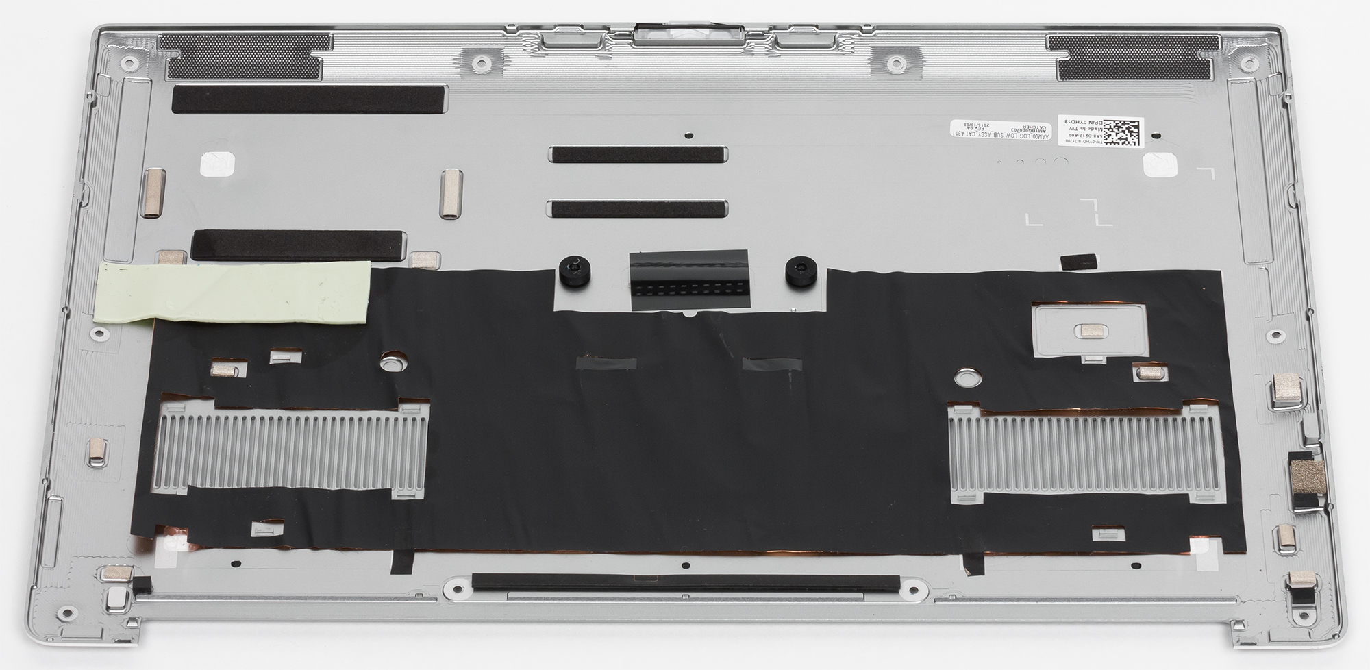 Есть на нижней панели и традиционный для ноутбуков серии XPS декоративный элемент. Это металлическая пластина с надписью XPS Причем эту пластину можно приподнять с одной стороны, и под ней на корпусе нанесена подробная информация о модели ноутбука.
